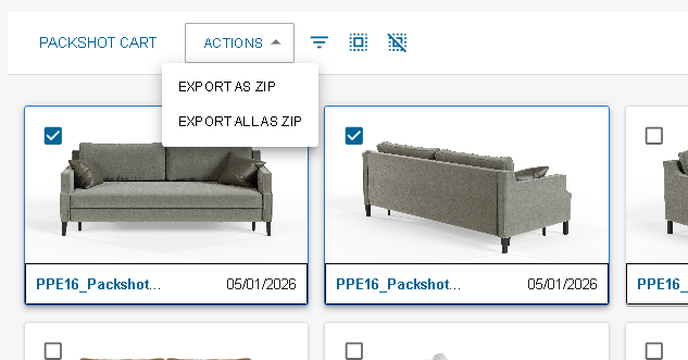 - Select packshots you want to export and then click on export or directly click on export all(you can use the filter)