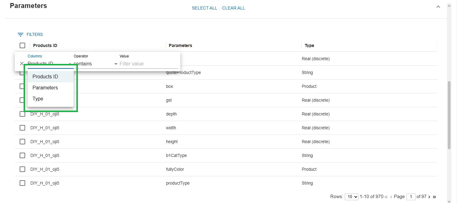You can also filter the parameters by Products ID, Parameters and Type values.